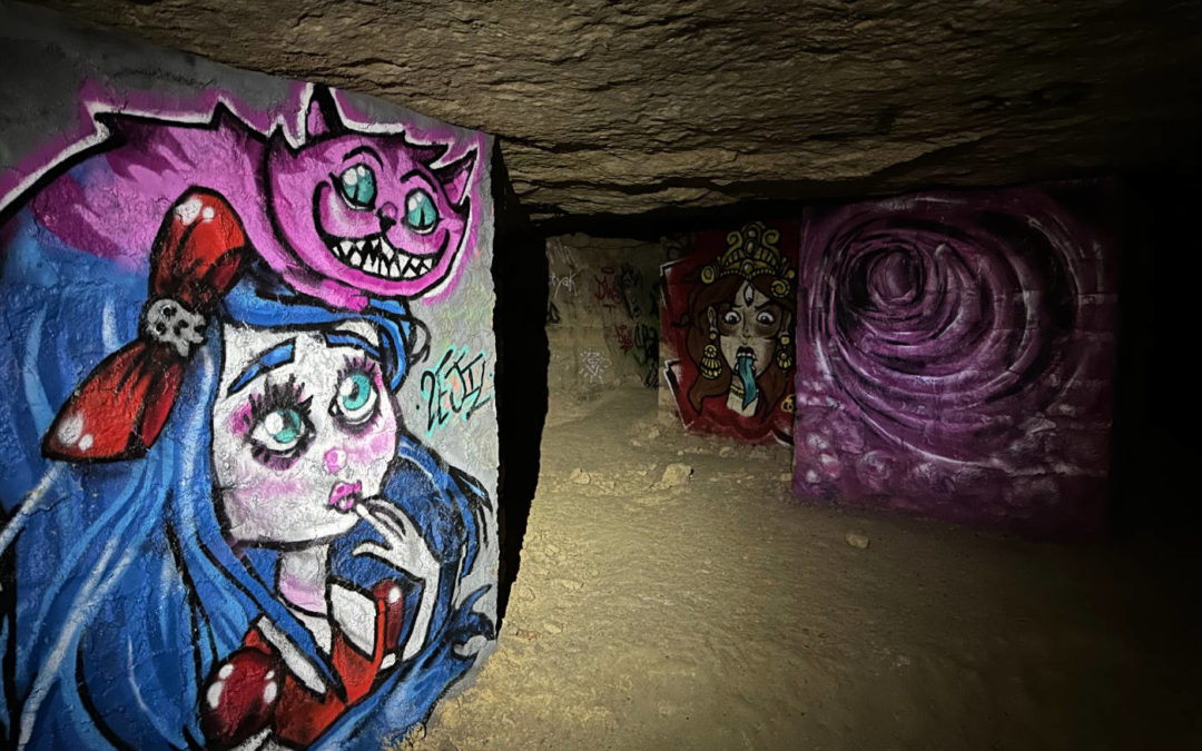 Vortex de couleurs au détour d’un tunnel dans les catacombes de Paris.