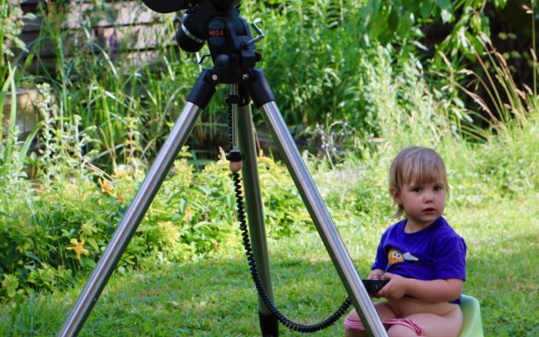 La scientifique sur son trône par inourpocket | Juin 27, 2015 | Archives, Entre amis, Photos, Un tour en France Maloé jouant avec le télescope de papa.