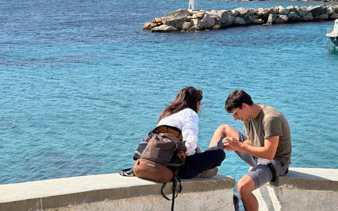 Tu l’as vu mon caillou ? par inourpocket | Mai 23, 2023 | Autour du Monde, Le travail c'est fun, Mer, Photos Thorsten et Mahyra en plein travail au dessus de l’affleurement d’Achladi à Syros.